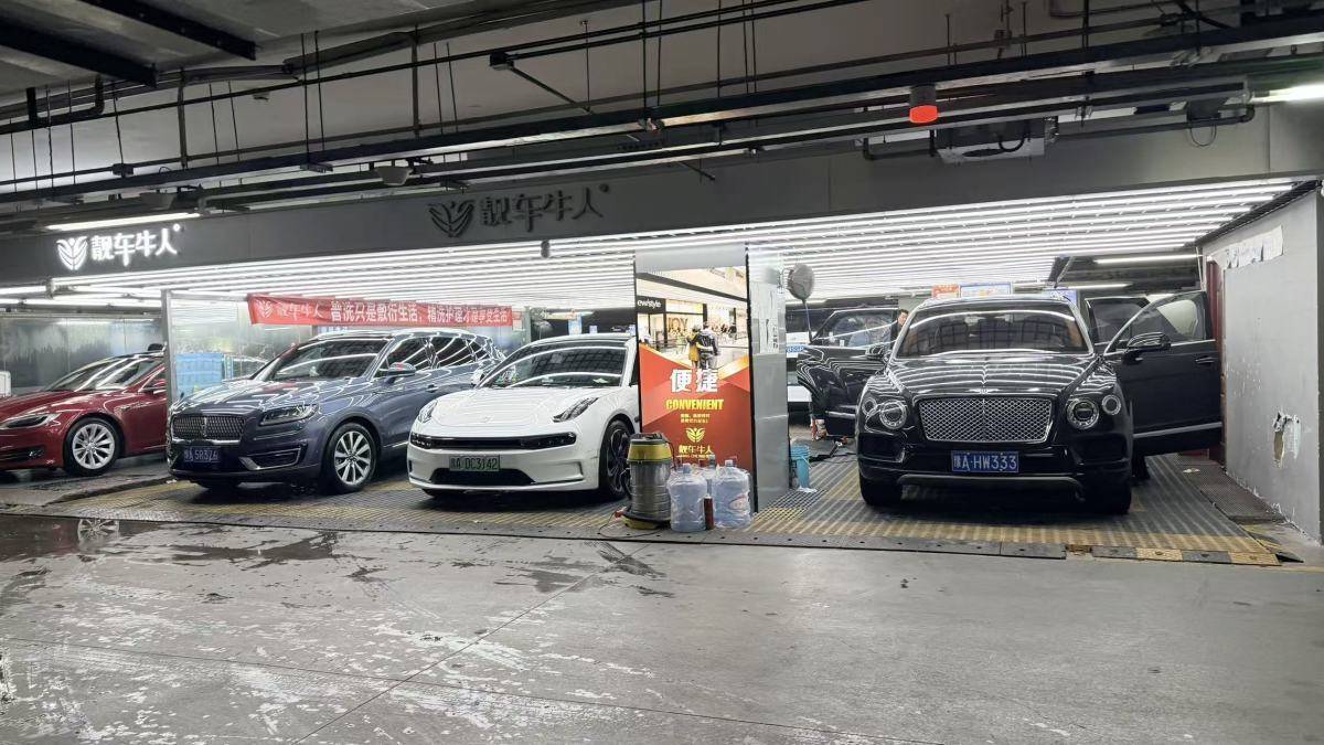 在熙地港一家洗车行内,现场一派忙碌景象。两台新能源车与两台燃油车并排停放,工作人员正有条不紊地进行清洗作业,各类车型的清洗流程并无差异。