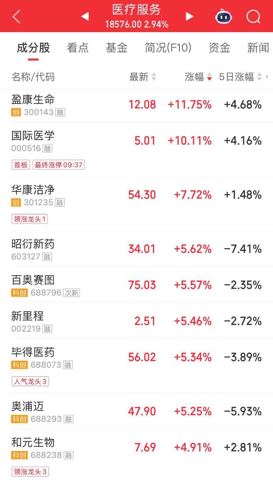3月6日,A股医药板块大爆发,医疗服务方向领涨。个股方面,截至10:25,盈康生命涨超10%领涨,国际医学涨停,华康洁净、昭衍新药、百奥赛图等多只个股跟涨。