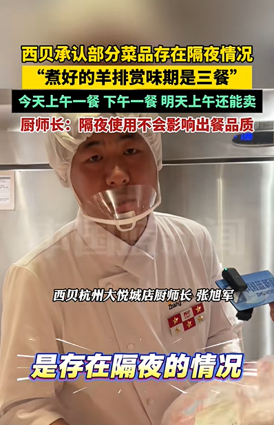 9月12日,也有媒体记者实地探访杭州西贝餐厅。西贝承认部分菜品存在隔夜情况,煮好的羊排赏味期是三餐,今天上午一餐、下午一餐、明天上午还能卖,厨师长称隔夜使用不会影响出餐品质。