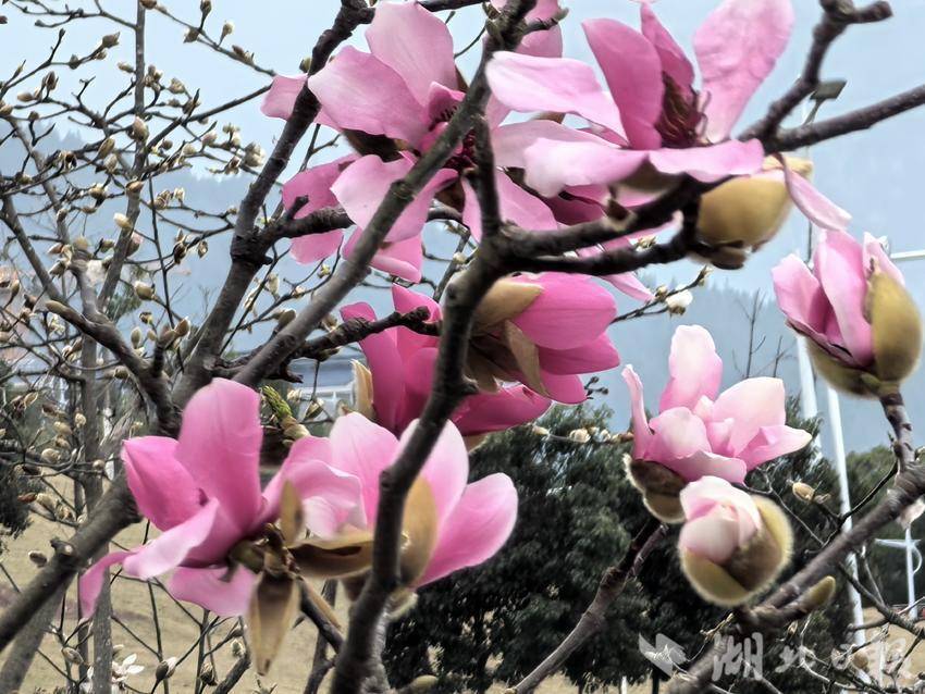 在巴东广场与街头巷尾,一株株玉兰树上,粉白相间的花朵如云似雾,次第绽放。花瓣舒展如蝶翼般轻盈通透,在微凉的春风中轻轻摇曳,与远处薄雾笼罩的山峦相映成画。有的花苞裹着细密的绒毛,静待绽放;有的已然盛放,吐露着淡雅的芬芳。